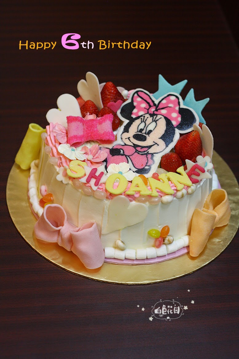 蛋糕体是英式柠檬蛋糕,外面涂满鲜奶油,米妮图案是巧克力转印,花朵是牛油糖霜,而心形和蝴蝶结都是朔型巧克力。